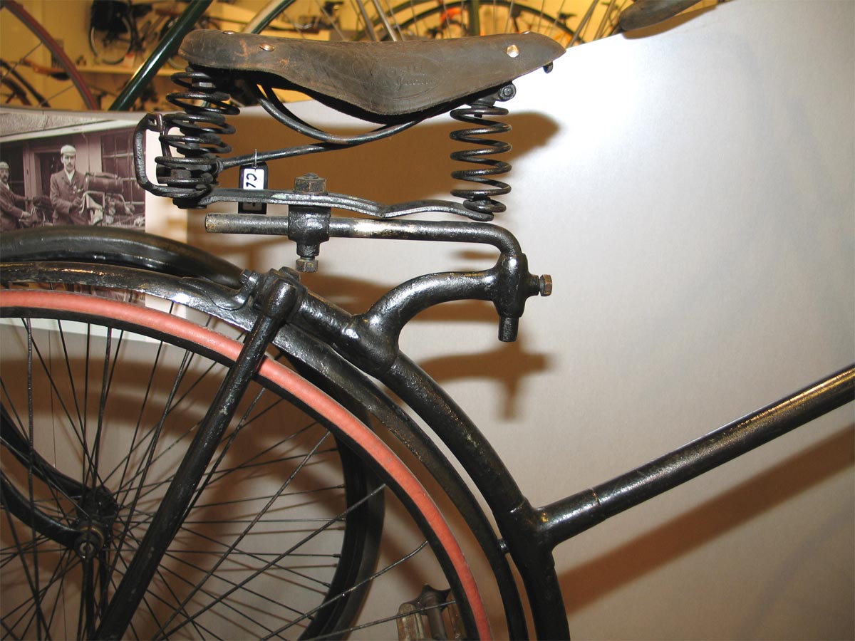 The safety you see in the pictures is a heavy bike, clearly one of the early safeties. It is to see in the Batavus museum in Heerenveen, Netherlands. The bike has a lot of characteristic details. The front suspension was used by more factories, but the double rubber blocks on the front fork foot rests are unique for pre-1890 Singer safeties. This bicycle looks quite original, it's a pity the front mudguard is missing.